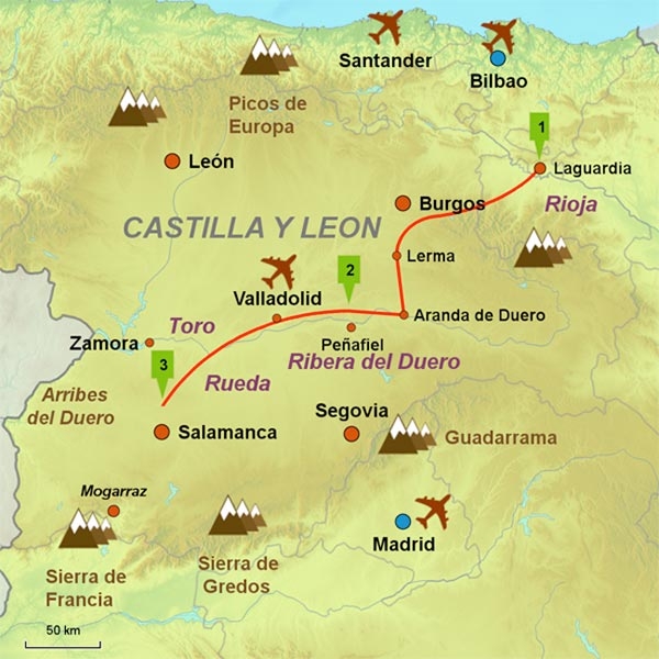 Rioja to Salamanca route, a 7 night self-drive independent tour in Spain. Hop from castle to castle and wend your way through Spain’s most prestigious wine regions, names to conjure with Rioja, Ribera del Duero, Toro and Rueda. Visit the great wine centres of Laguardia, Haro, Logroño, Peñafiel and Valladolid and ‘drink in’ the traditions and beautiful landscapes.